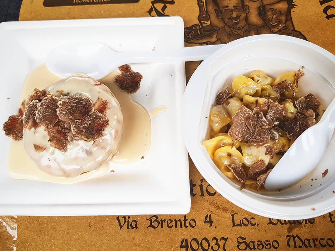At the food and wine stands in the squares of the historic centre, you can taste traditional dishes such as delicious pumpkin cappellacci, cappelletti in broth, passatelli with truffles and salama da sugo.
