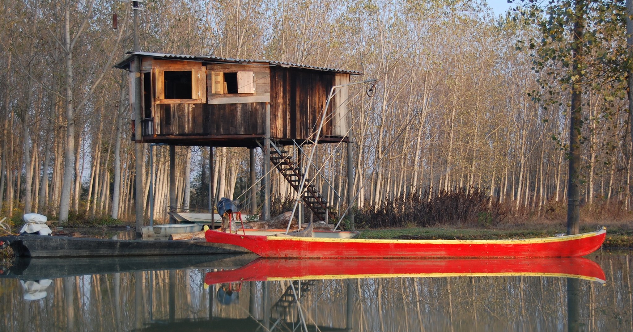 - capanno da pesca semipalafitticolo, soluzione ibrida con parte che sporge sull’acqua e parte che poggia sulla terra;